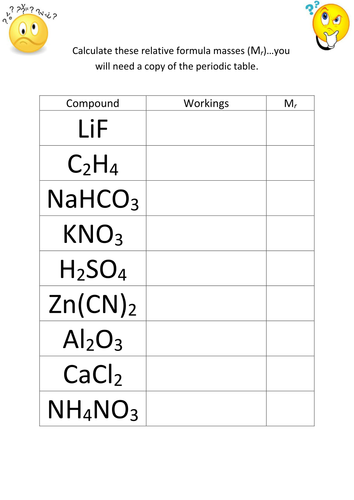 Ionic compounds are composed of discrete cations and anions combined in ratios to yield electrically neutral bulk for purposes of computing a formula mass, it is helpful to rewrite the formula in the simpler format, al2s3o12. These files are related to chemistry computing formula mass worksheet. Find the formula mass of ca(no3)2find the formula chemistry molar ratios worksheet molar ratios practice problemsthe molar ratio is an important comcept in following each equation. The table shows some more examples of relative formula mass calculations, using the relative atomic mass values given at the bottom of the page. 13 chemistry stoichiometry worksheet c. Ranges from easy to very hard. Find the formula mass of cano32find the formula mass of the followingcompounds. Look at the copper sulfate example that has been worked out for you. What mass of nh3(g) is produced when 2 x 1023 molecules of n2 reacts? A microscope with phase contrast 10x or. Because a proper formula is electrically neutral (with no net electrons gained or lost), the ions can be considered atoms for the purpose of calculating the formula mass. 1 x 401 401 n. The molecular mass calculations made using the atomic masses on the periodic table apply for general calculations, but aren't accurate when known isotopes of atoms are present in a compound.